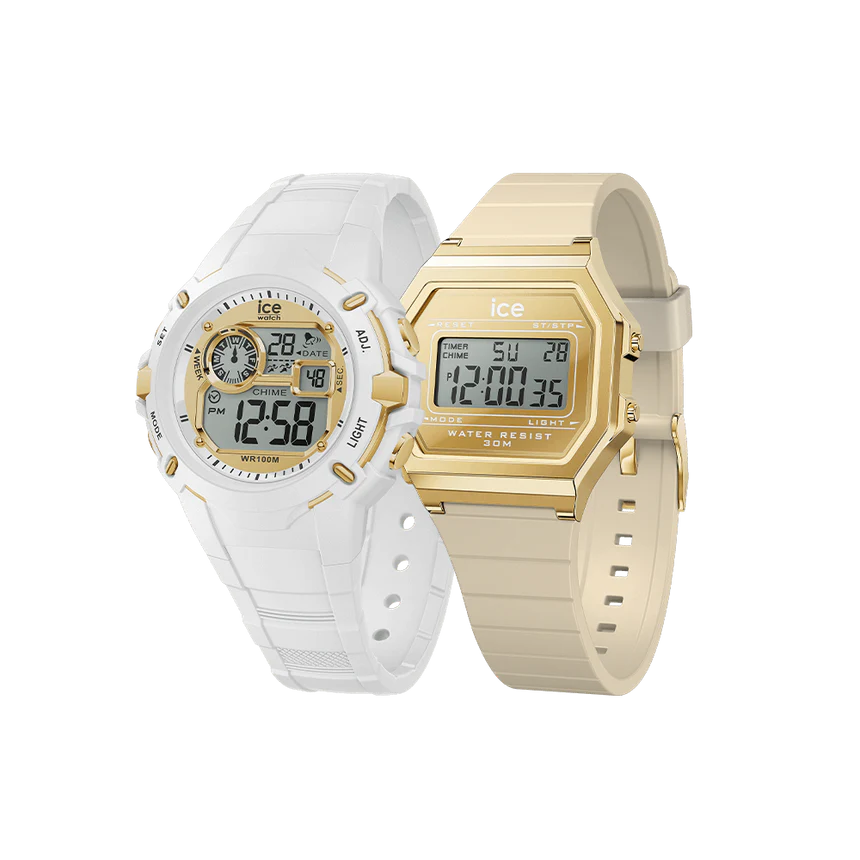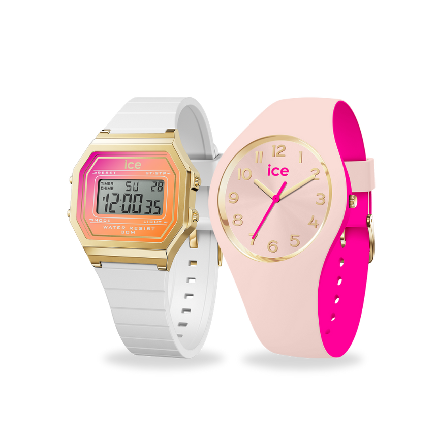 Live life in technicolor with the ICE digit retro - White sunkissed. Its sunset dial features a dazzling gradient of fuchsia blending with luminous orange tones, offering a captivating visual spectacle inspired by the vibrant hues of the sky at dusk. Paired with a white silicone strap, this watch embodies boldness and modernity, bringing a touch of freshness and sophistication to your look.